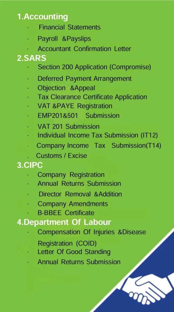 We do tax returns, VAT 201 ,claim tax returns, send compromise letter if you owe sars .