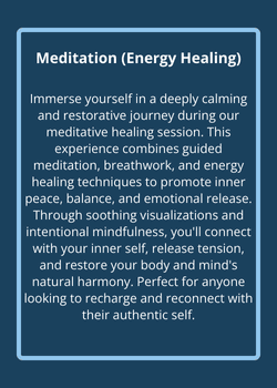 Meditation Energy Healing is a 60-minute restorative journey designed to calm the mind, release tension, and realign your inner energy. This powerful session combines guided meditation, breathwork, and energy healing techniques to help you return to a state of harmony and wholeness.
